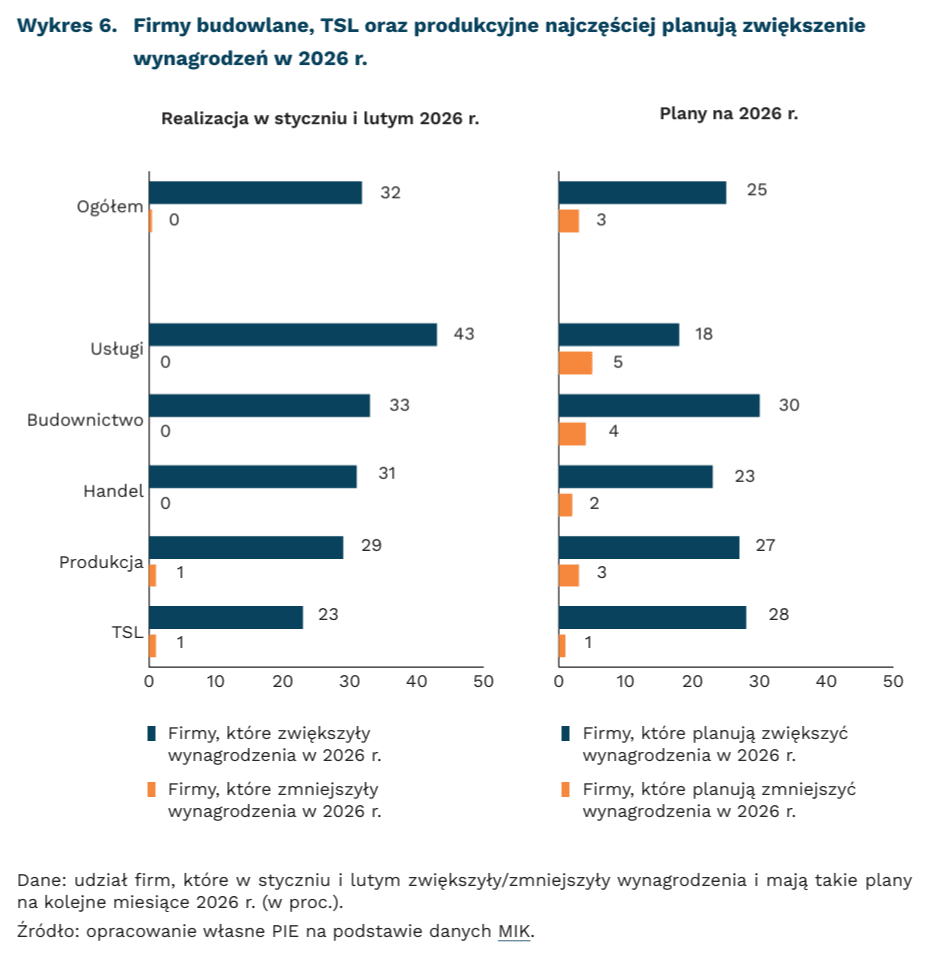 Optymizm mikroekonomiczny: Mimo mniejszego entuzjazmu niż w 2024 roku (kiedy podwyżki planowało 36% firm), rynek pracy pozostaje stabilny z wyraźną tendencją do wyrównywania płac w branżach produkcyjnych i budowlanych w drugiej połowie roku.