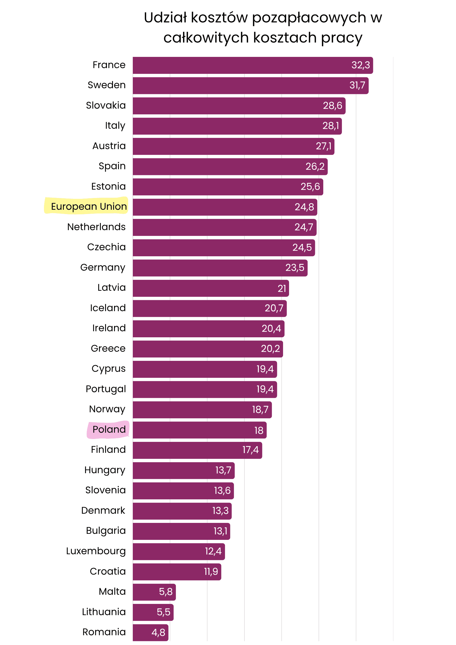 Dwa główne składniki kosztów pracy to wynagrodzenia oraz koszty pozapłacowe (np. składki na ubezpieczenia społeczne płacone przez pracodawców). Udział kosztów pozapłacowych w całkowitych kosztach pracy wyniósł 24,8% w UE i 25,6% w strefie euro. Najniższy udział tych kosztów odnotowano w Rumunii (4,8%), na Litwie (5,5%) i Malcie (5,8%), a najwyższy we Francji (32,3%), Szwecji (31,7%) oraz na Słowacji (28,6%).