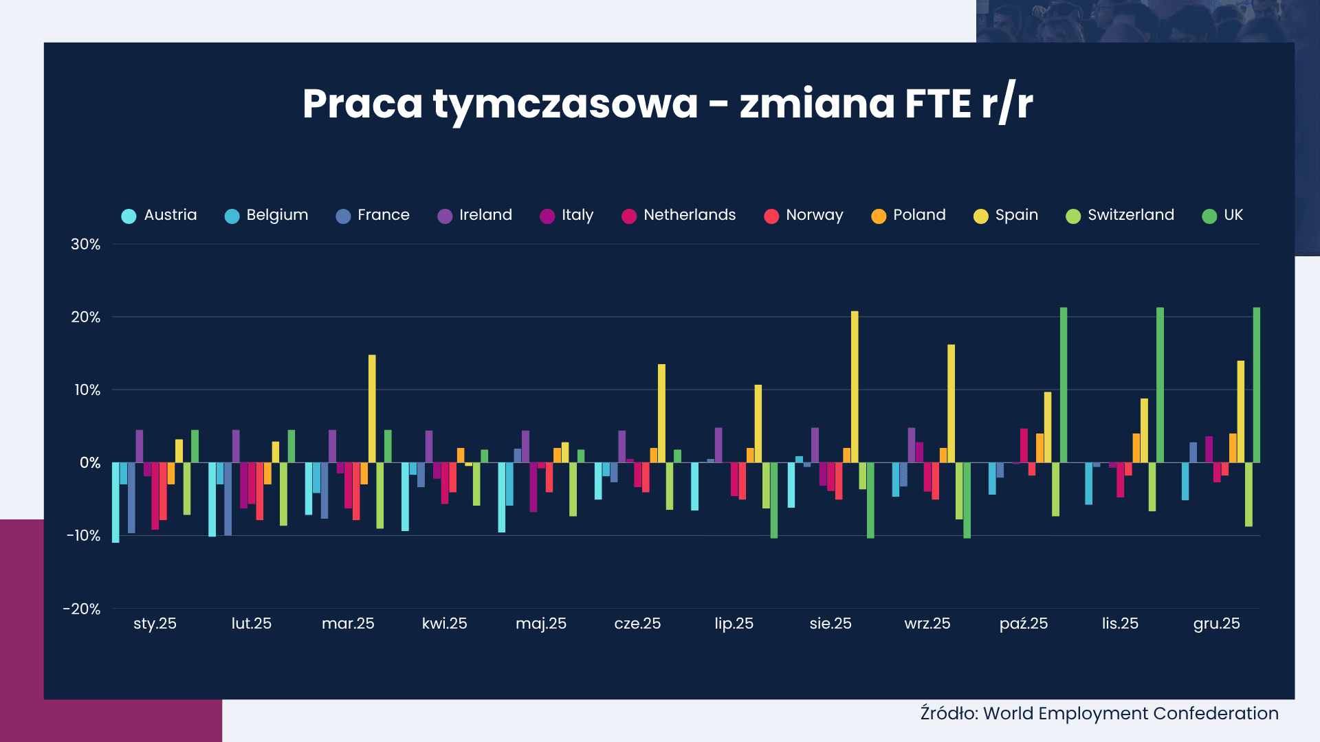 Pod koniec 2025 r. aktywność pracy tymczasowej w Europie ustabilizowała się, jednak wzrost jest słaby i zróżnicowany między krajami.