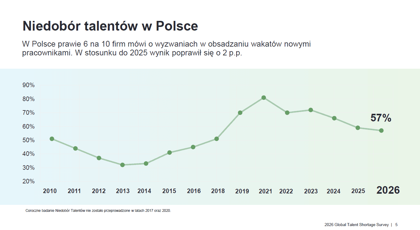 Zgodnie z raportem ManpowerGroup „Niedobór talentów”, 57% polskich pracodawców przyznaje, że napotyka trudności w pozyskiwaniu nowych pracowników. To o 2 pp. mniej niż rok temu, a wskaźnik maleje od 5 lat. Nie oznacza to jednak, że presja na rynku maleje. Zmienia się jej charakter.