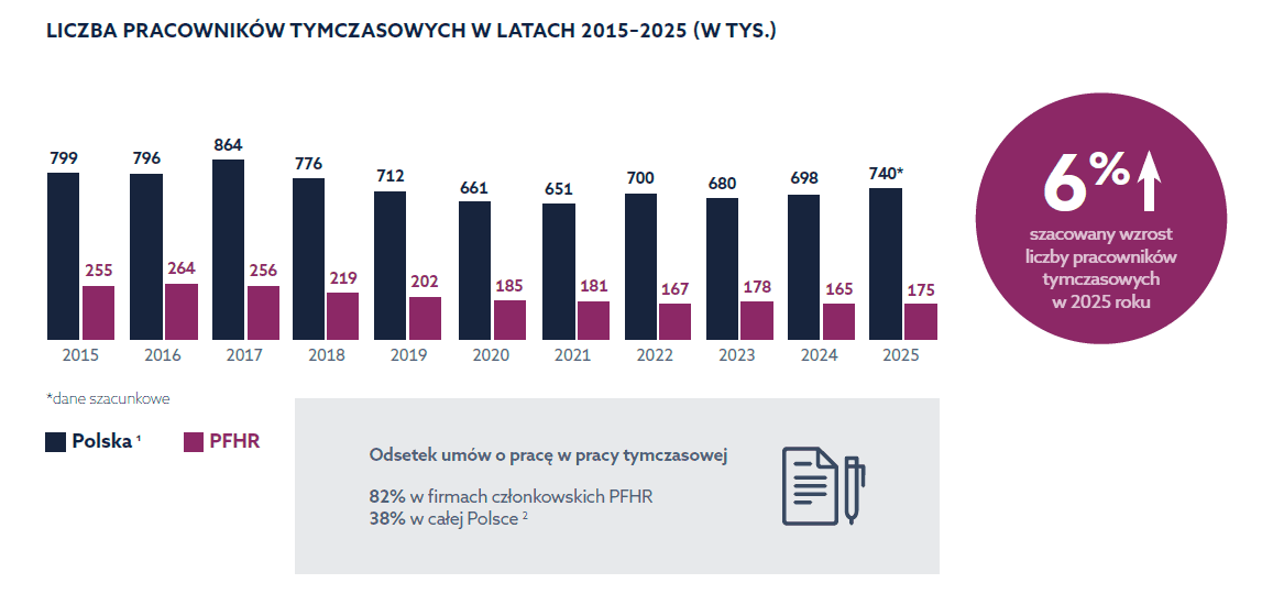 Obroty firm członkowskich w zakresie pracy tymczasowej w 2025 roku wyniosły blisko 4,8 mld zł. Szacowana wartość całego polskiego rynku to ok. 7,4 mld zł, co oznacza wzrost o 6% rok do roku. Taki sam wzrost odnotowaliśmy w liczbie zatrudnionych pracowników. W firmach członkowskich PFHR aż 82% osób wykonuje pracę tymczasową w oparciu o umowę o pracę (dla całego rynku wskaźnik ten wynosi 38%). Dodatkowo rośnie też liczba godzin, które przepracowali pracownicy tymczasowi.