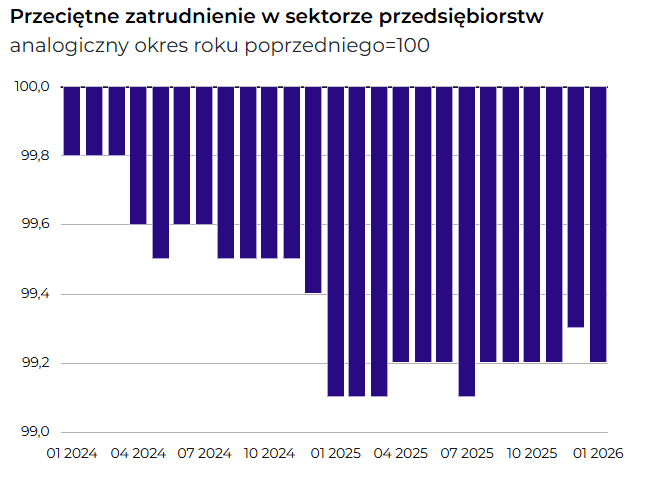 Przeciętne zatrudnienie w sektorze przedsiębiorstw (podmiotach o liczbie pracujących powyżej 9 osób w przeliczeniu na etaty) w styczniu 2026 r. wyniosło 6400,5 tys. i było o 0,8% mniejsze niż przed rokiem.