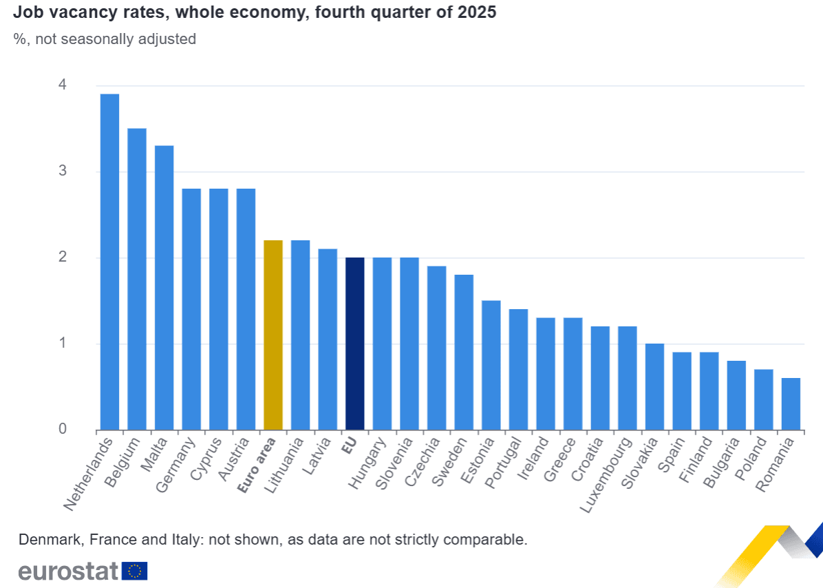 W IV kwartale 2025 r. wskaźnik wolnych miejsc pracy w strefie euro wyniósł 2,2% – wzrósł z 2,1% w III kwartale 2025 r., ale spadł z 2,5% rok wcześniej. W Polsce był jednym z najniższych w Europie.